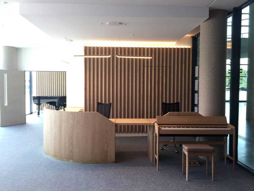 Tous les mobiliers ont été soigneusement réalisés sur mesure en bois massif pour accueillir au mieux les visiteurs et les musiciens. Une qualité de réalisation qui devait être à la hauteur des instruments en bois proposés. SOMA a accompagné la société pour la création des enseignes extérieures selon la charte du bâtiment mais a également imaginé une réponse appropriée intérieure à l’image de marque pour l’enseigne.