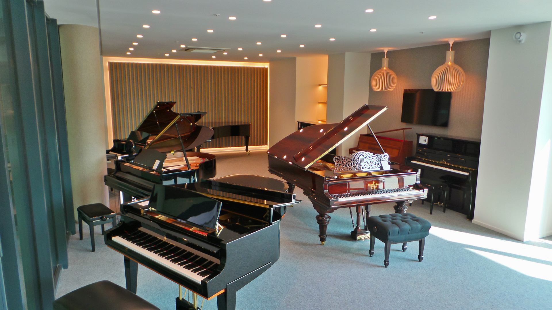 Des teintes naturelles et neutres ont été apportées pour s’harmoniser avec le béton ciré gris du Grand Foyer de la Seine Musicale et faire du piano, le plus souvent de couleur foncée, la pièce majeure des espaces. Une moquette grise propose des propriétés acoustiques et résistance adaptée aux roues des pianos. Le doublage acoustique est assuré par des parois verticales en feutre et bois. Des gorges lumineuses apportent une atmosphère douce et une lumière maitrisée pour les essais musicaux dans le studio.